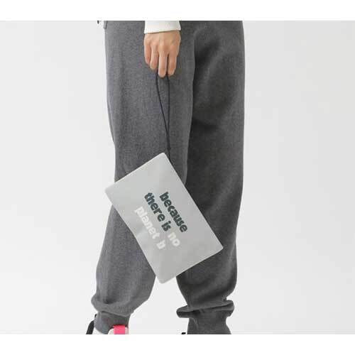 日常使いで重宝するクラッチバッグLUPITA。再生ペットボトルのポリエステル生地を使用したサステナブル雑貨です。ブランドメッセージ【BECAUSE THERE IS NO PLANET B】をデザイン。少しのコトから、環境に良いモノへ。